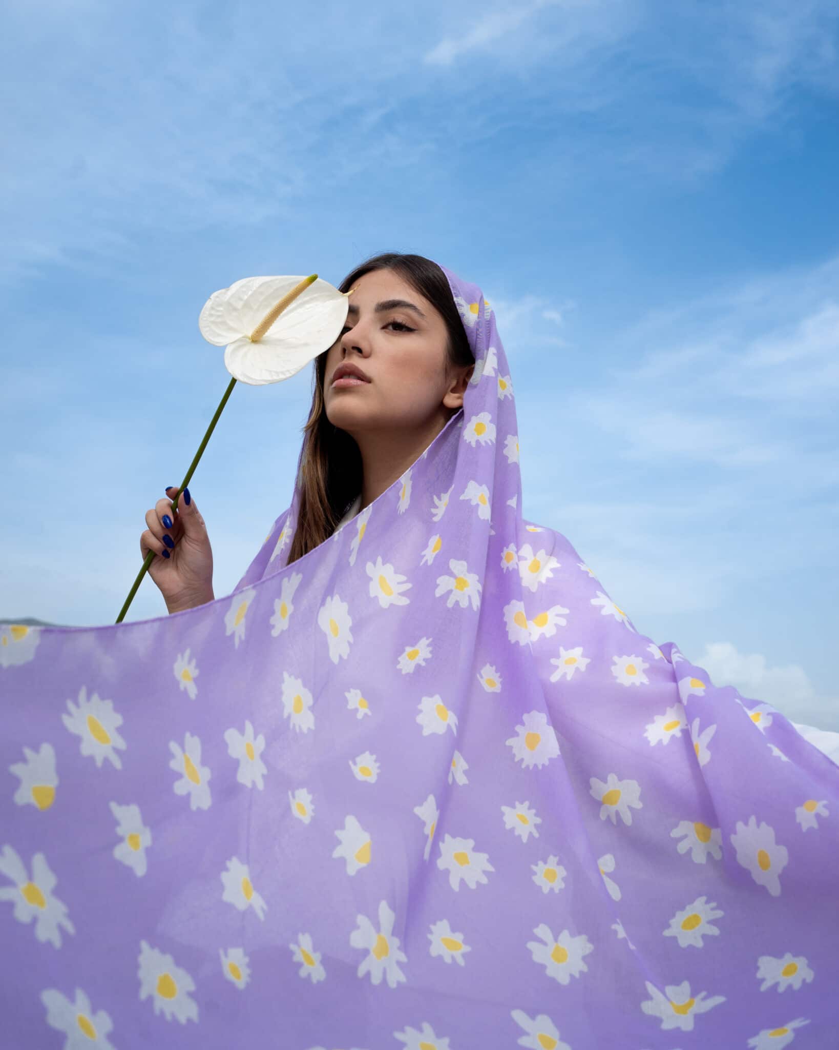 این شال بابونه زیبا بر روی پارچه نخی چاپ شده است